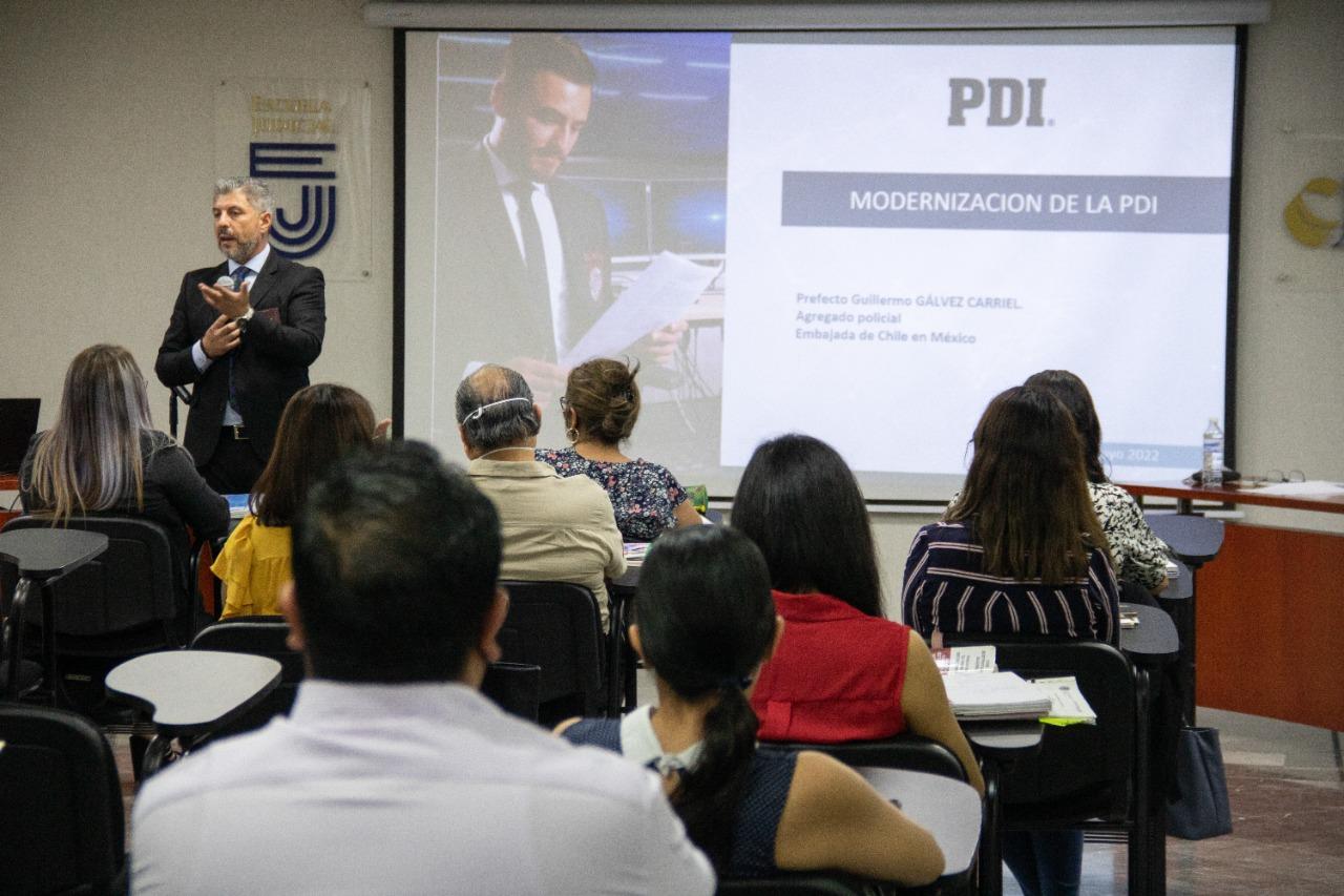 Es así que, con el objetivo de fortalecer las buenas prácticas en materia de seguridad pública, el agregado de la Policía de Investigación de Chile en México -quien cuenta con amplia experiencia en la policía de su país en materia de investigación- compartió con los integrantes del Diplomado los procesos de profesionalización de la Policía de Investigación de Chile (PDI) así como la función policial y el respeto a los derechos humanos.