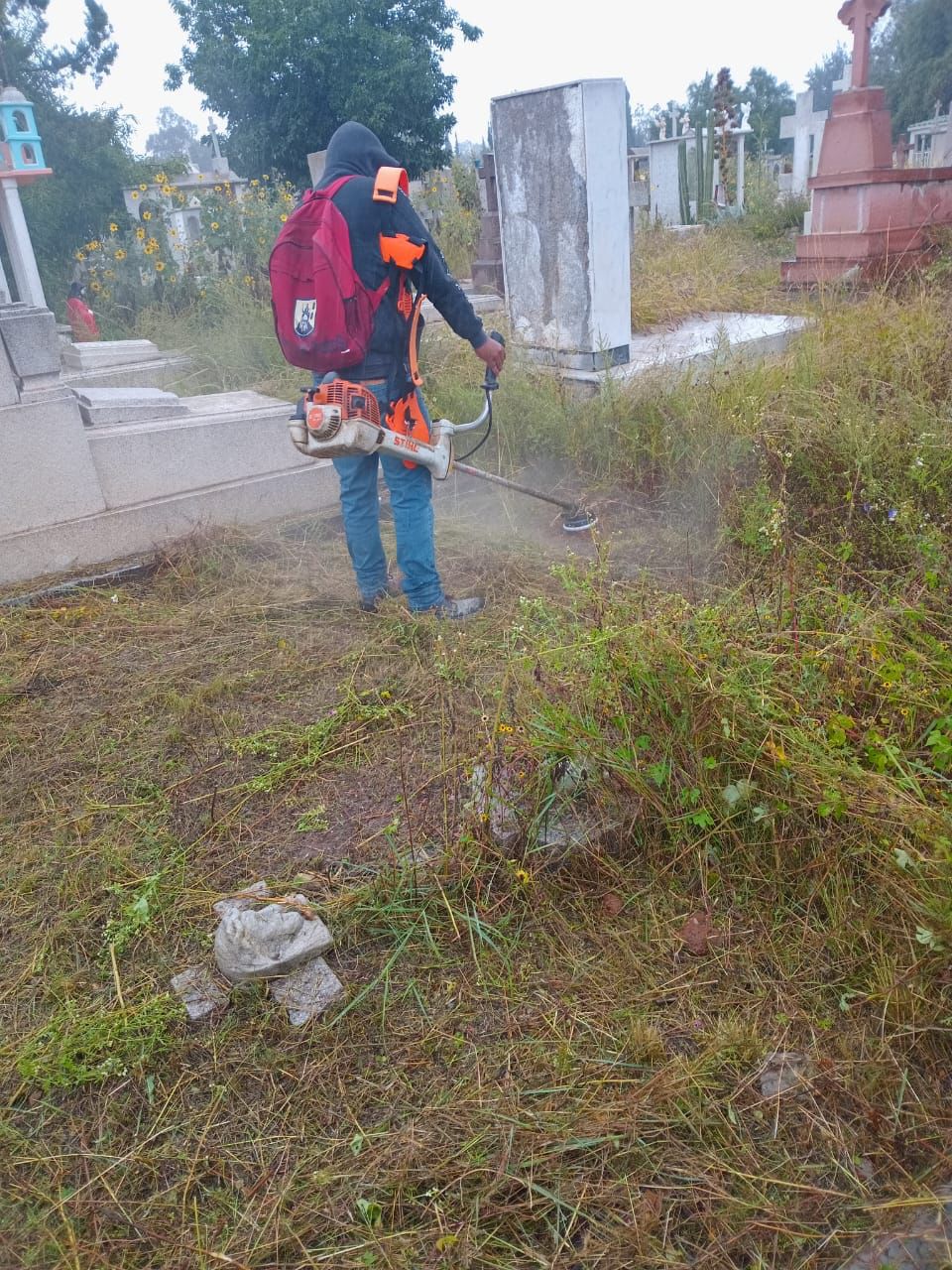 Con el fin de mantener en buen estado las zonas peatonales y dar mayor seguridad a los visitantes, el Gobierno Municipal trabaja en la limpieza y retiro de maleza del cementerio El Saucito.